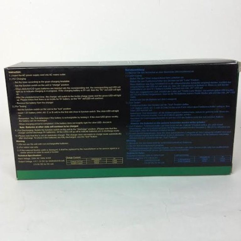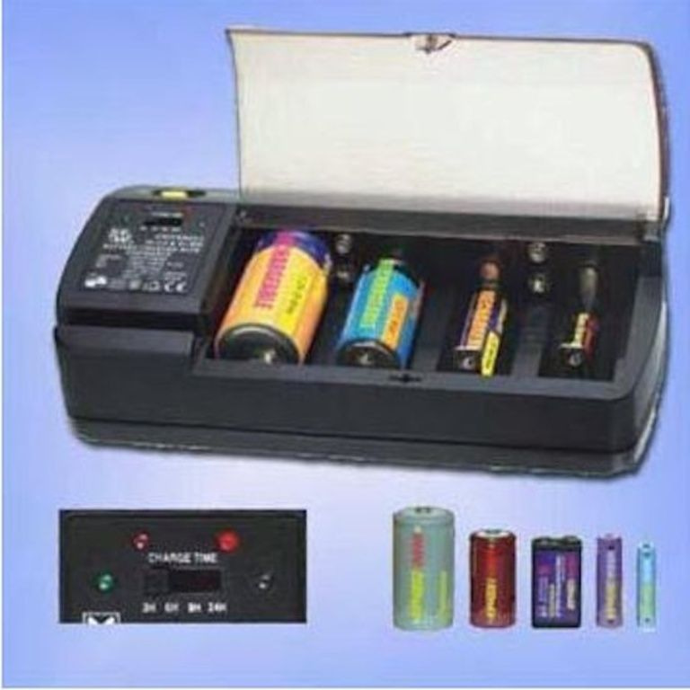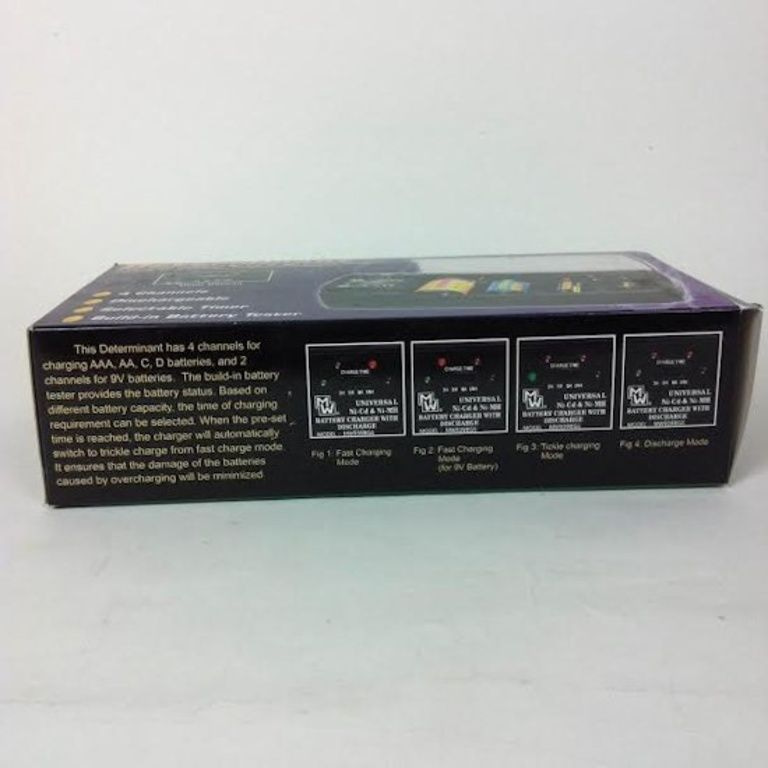 4 canaux universel Ni-Cd Ni-MH chargeur de batterie avec commande minuteur sélectionnable. Avec des réglages de minuterie pour les batteries de différentes capacités. Pour 1-4pcs de Micro AAA, Mignon AA, Baby C, Mono D et 1-2pcs 9V ou Ni-Cd Ni-MH