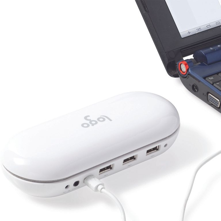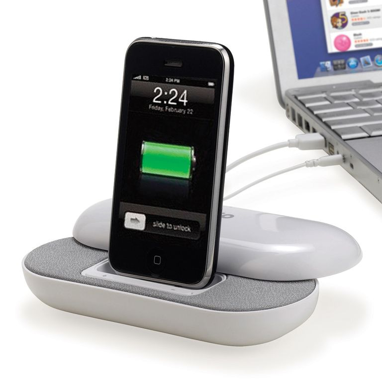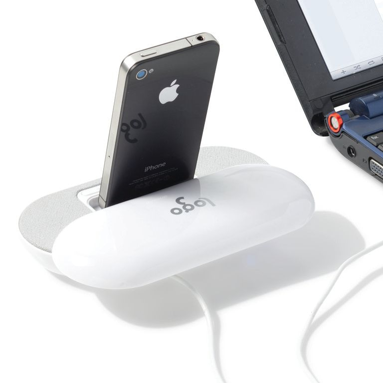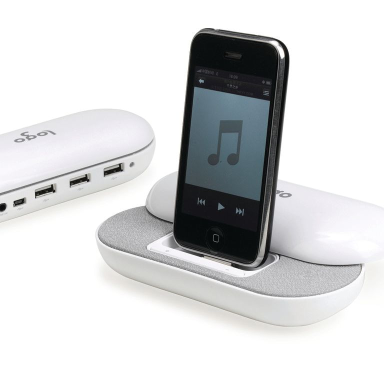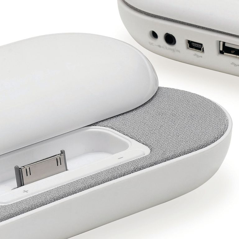 iPhone / iPod (TM) stéréo Station d'accueil. USB 2.0 offre trois ports USB. Convient pour les téléphones intelligents, MP3 / MP4, les ordinateurs portables et les PC via la ligne 3,5 mm câble fourni. 2 x 1.5W Sortie iPhone / iPod. Matériel: ABS.