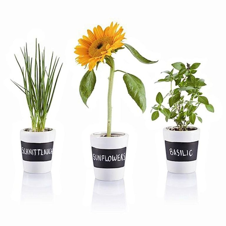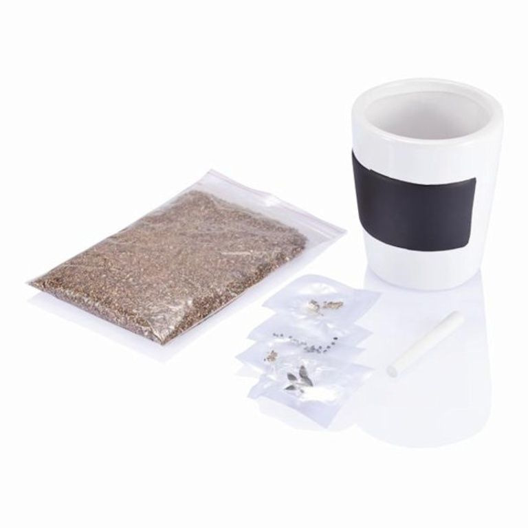 Ensemble de 3 pots d'herbes en céramique avec une surface tableau. Y compris la craie, du sol et des semences pour le persil, la ciboulette, le basilic et les graines de tournesol.