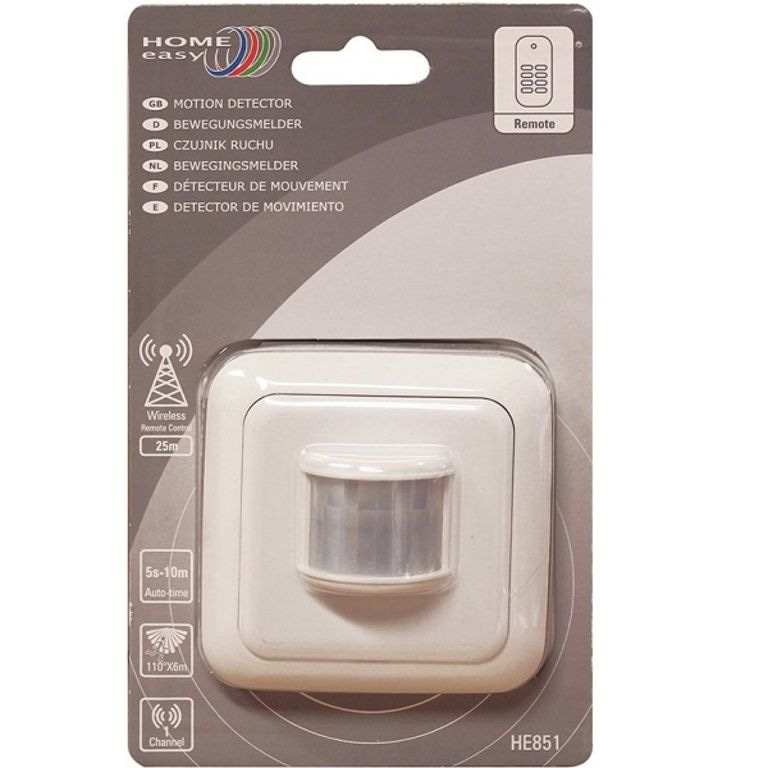 HOME EASY Détecteur de mouvement sans fil pour une utilisation en intérieur. Ce détecteur de mouvement Home Easy convient au montage sur un point fixe du mur. L'éclairage est automatiquement allumé lorsqu'un mouvement est détecté. Dès qu’il n’ya plus de mouvement dans la plage de détection, la lampe s’éteint à nouveau après un délai prédéfini. Vous pouvez choisir différentes périodes pour cela: 5 s, 1 min, 5 min ou 10 min La portée de transmission sans fil est de 25 mètres. Points forts et détails Groupes de commutation et groupes de commutation individuels Portée de détection: 8 mètres maximum Le signal passe par les fenêtres, portes, murs et plafonds S'allume lors du déplacement et s'éteint de nouveau après l'heure définie EAN: 8711658257525