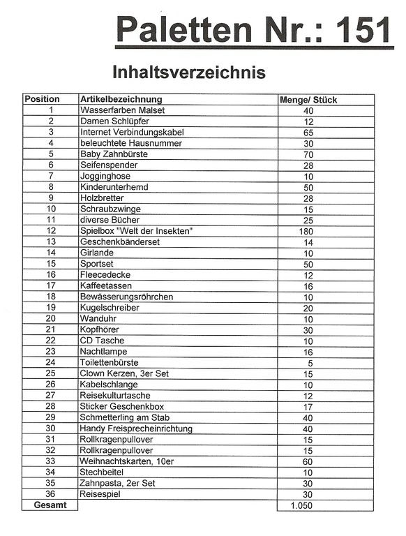 Le contenu des palettes: 1050 articles St. plusieurs!