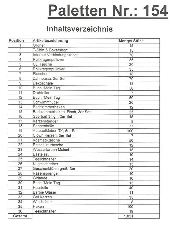 Palette Contenu: 1. St. 051 articles différents!