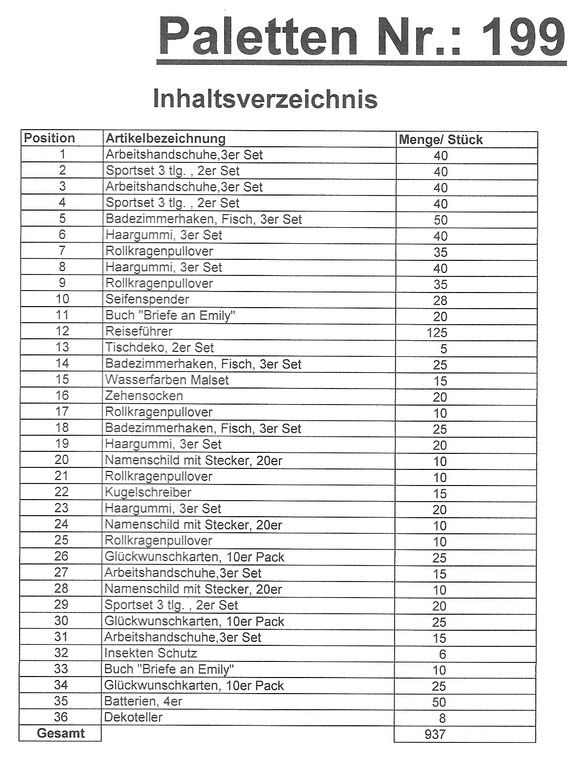 Le contenu des palettes: 937 articles St. plusieurs!