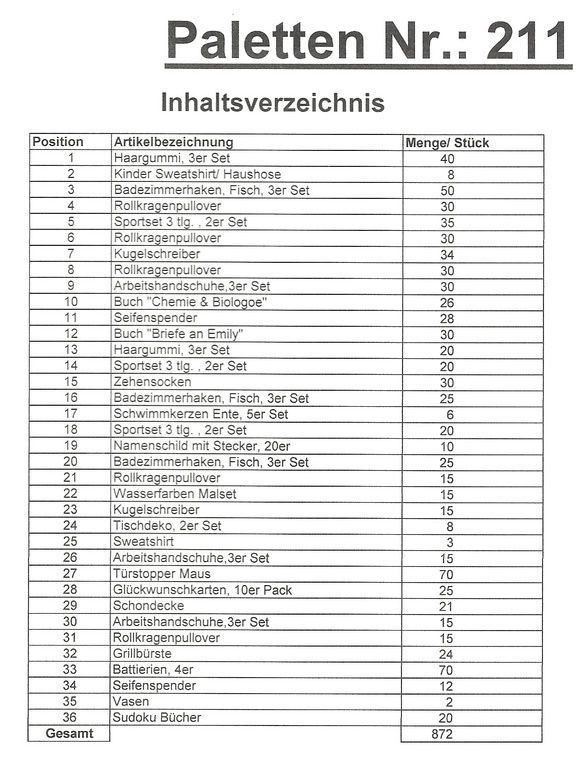Le contenu des palettes: 872 articles St. plusieurs!