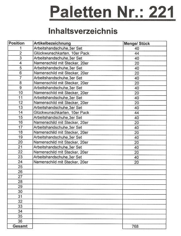 Le contenu des palettes: 768 articles St. plusieurs!