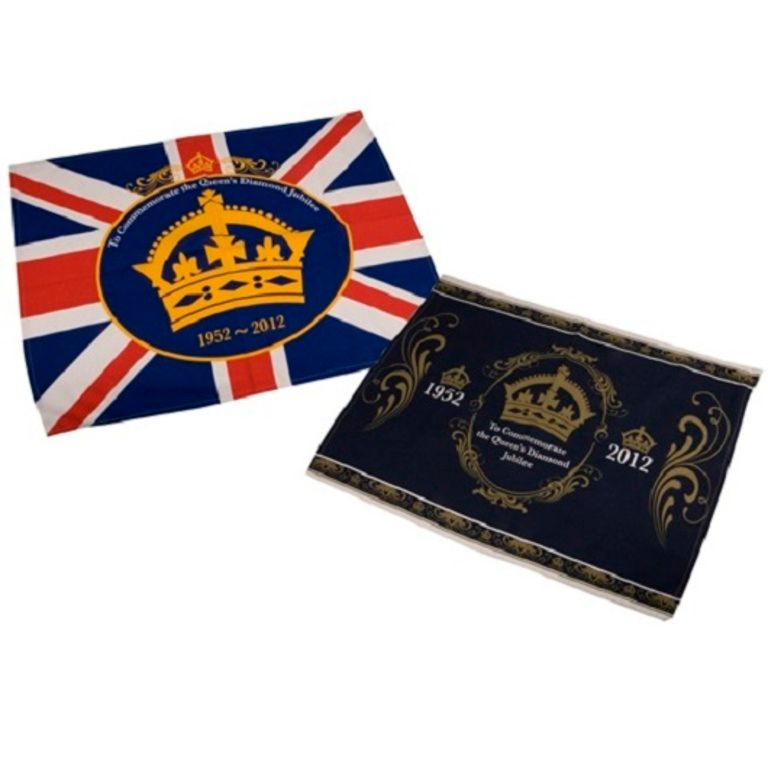 Une belle grande serviette de thé avec le drapeau anglais et les couronnent.