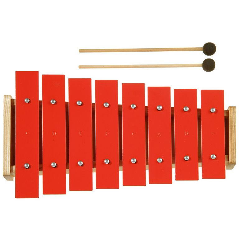 Avec des bâtons à la main, le petit musicien sa propre musique. Le Métallophone a un cadre en bois et barres de tonalité de couleur.