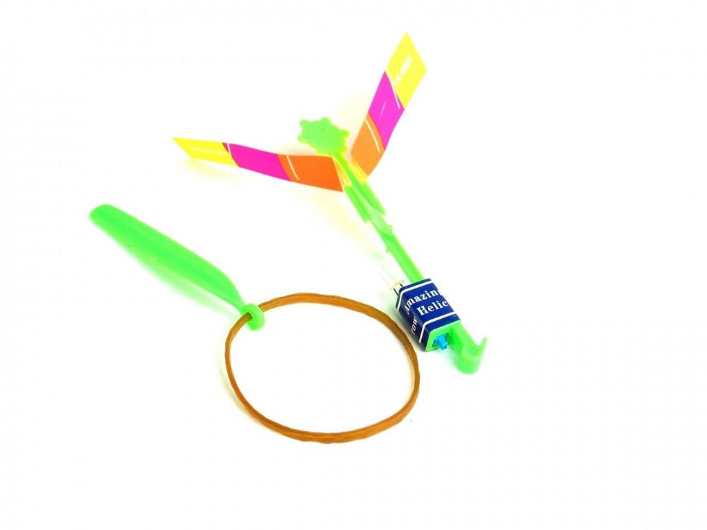 Accrochez l'élastique derrière l'hélicoptère et le serrer. Qu'il s'en aille et il tire pieds en l'air. Hélicoptère est équipé d'éclairage, ce qui donne un superbe effet dans l'obscurité.